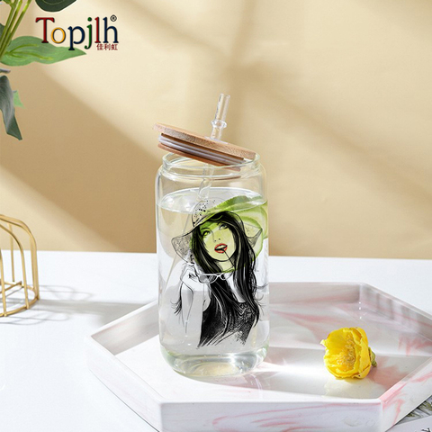 Topjlh 16oz Sublimation Blank Glass Tumbler Bamboo Lid Straw for Custom Logo Cola Water Bottle Promotion